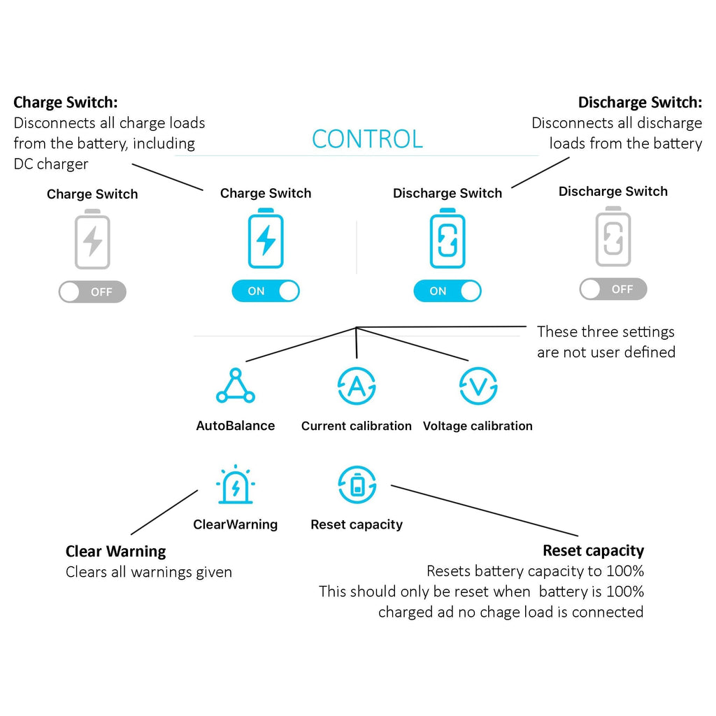 The Bluetooth app offers the ability to control the charge or discharge loads from the battery by remotely switching ON / OFF the power via the Bluetooth App.