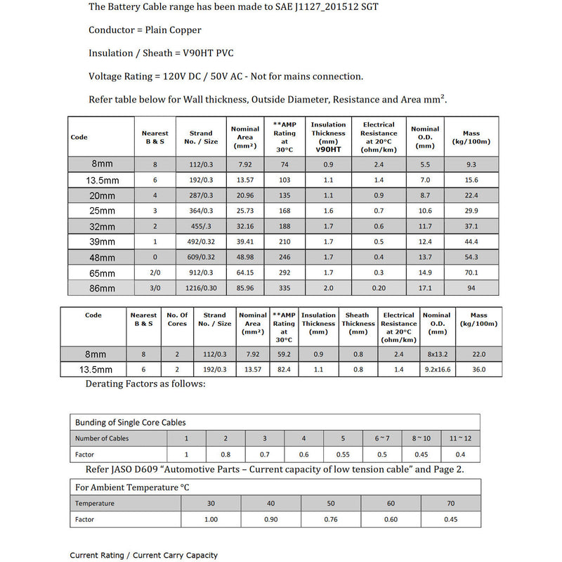 Rated to approx 190 Amps over 10mt continuous @ 30degrees