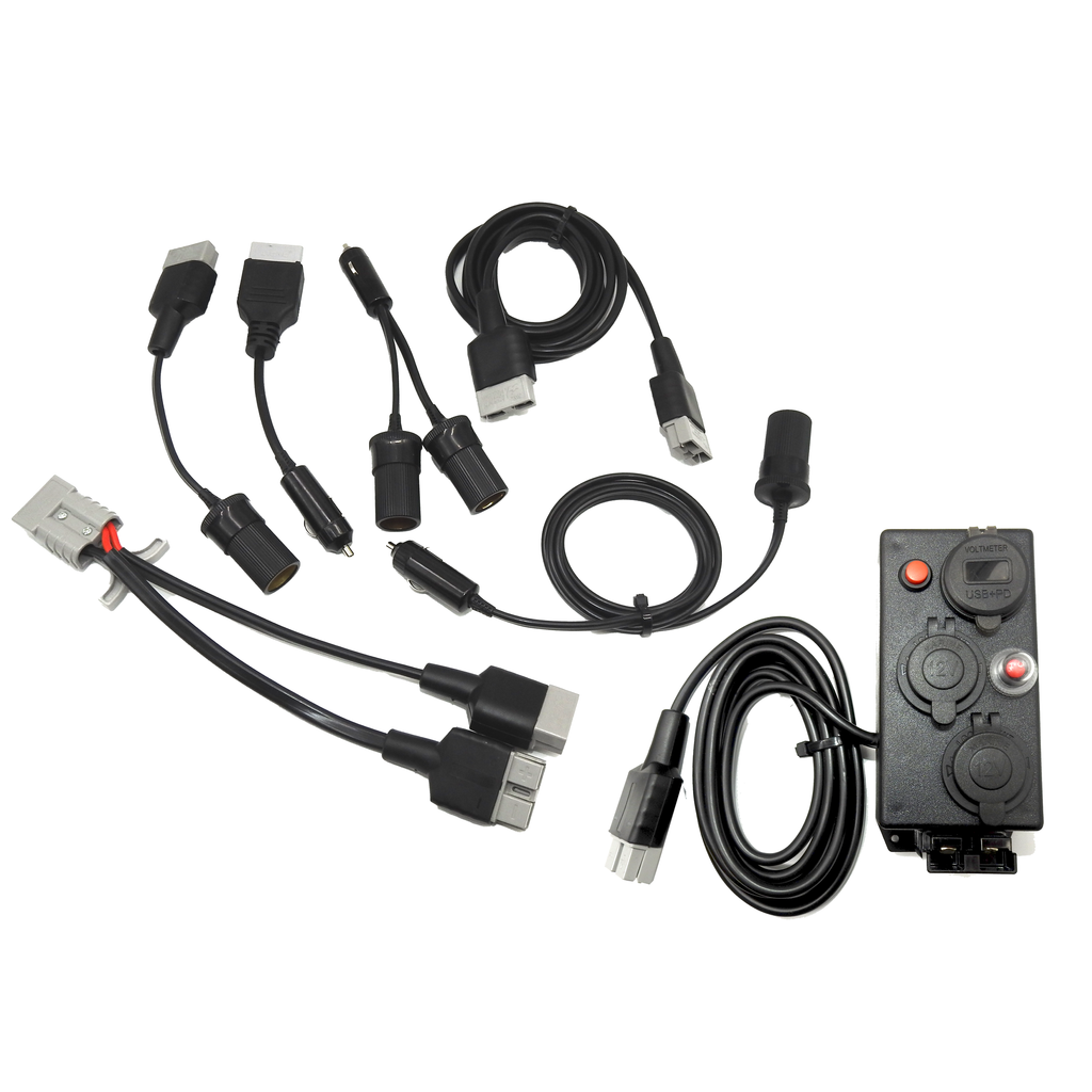 Control box fitted with 2 x Cigarette sockets | 1 x Volt | 1 x USB-A + 1 x USB-C + 1 x 50Amp Anderson | 1 x push button | 1 x circuit breaker | 2mt 6mm lead to Anderson connector |