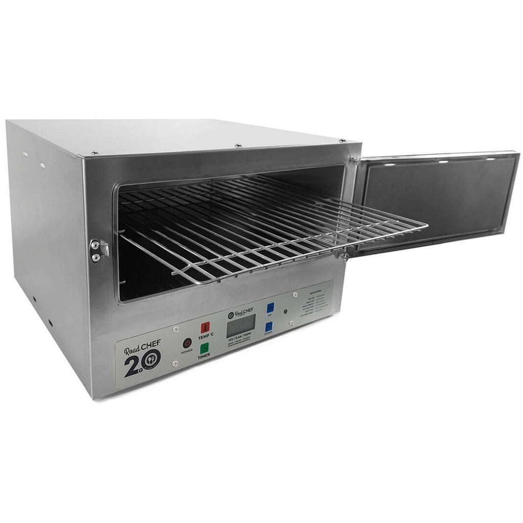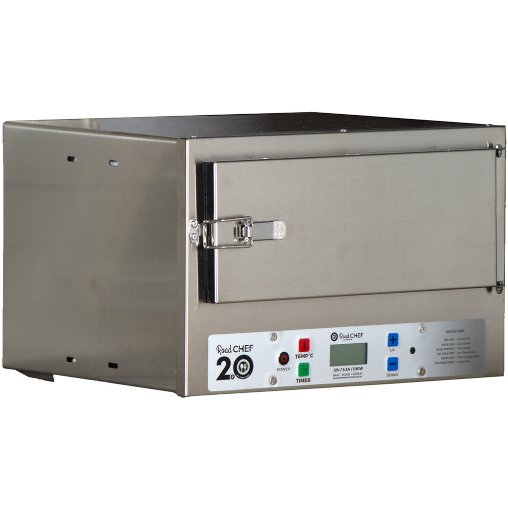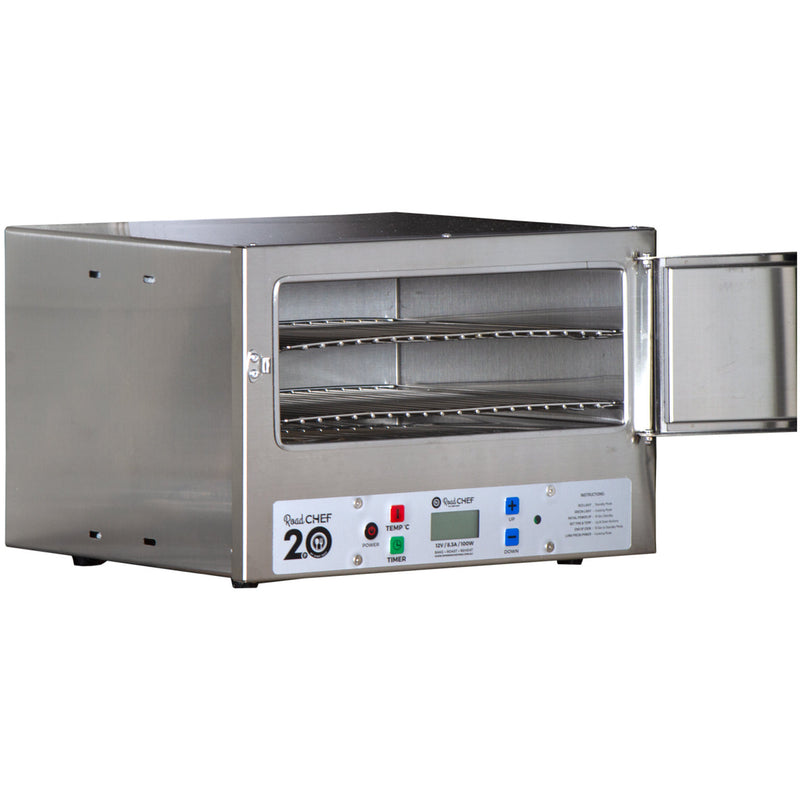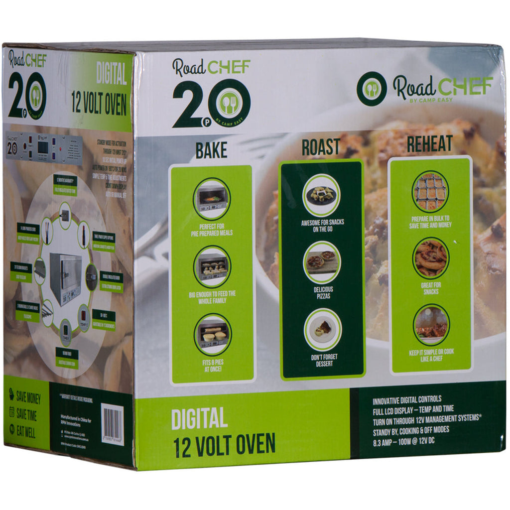 The latest addition to the Road Chef stables, the Road Chef 2.0 – Digital 12 Volt Oven® takes cooking on the road to a new innovative level. The 2.0 is the smarter way to cook, combining the traditional look and feel of the Road Chef but taking it to a new level. The new digital interface allows the user to adjust both the cook time and temperature simply through soft push buttons allowing a higher level of accuracy for both functions. As the cook timer counts down it is displayed allowing the cook to easily adjust it and know how long before their delicious meal is ready!