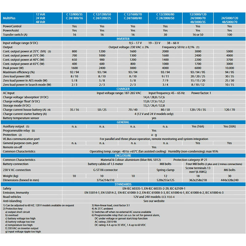Multiplus Compact inverter chargers are available in models ranging from 800VA to 2,000VA. The generator assist supports air conditioning with smaller generators which makes it perfect for caravans and RV's.