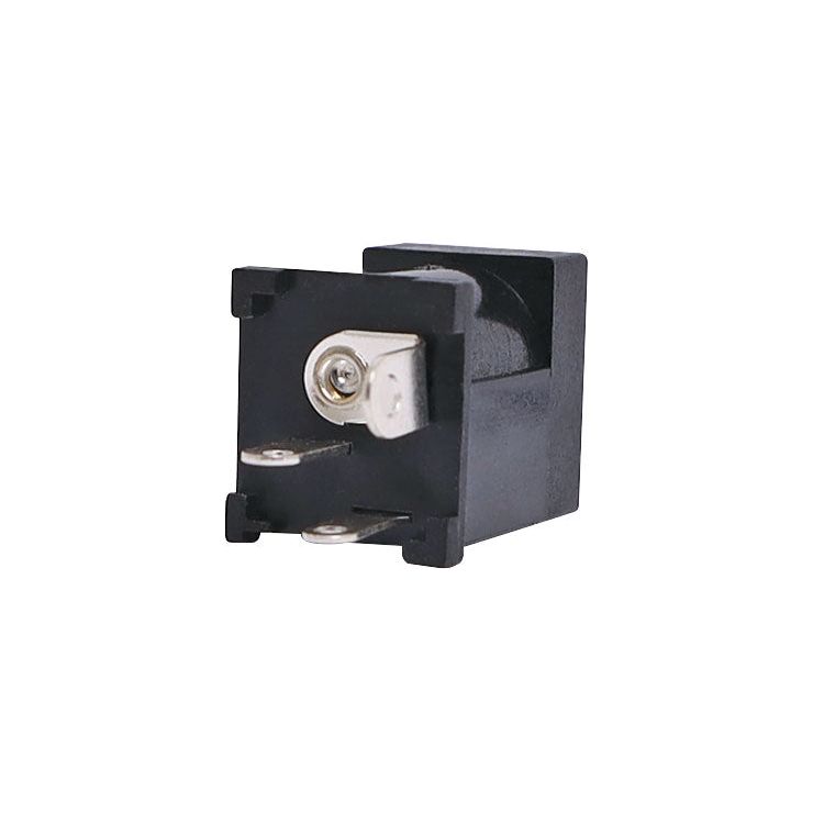 A vertical mount PCB DC power socket with 2.1mm jack entry.