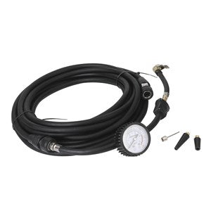 Includes an 8m detachable air hose, zipper carry bag, spring clamps for battery attachment, and inflation adapters.