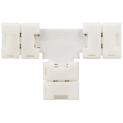 A simple clip on T shape connector suitable with any single colour 5050/5060 SMD LED strip lights. It allows you to connect three LED strips together in a T shape without the need for soldering the connections.