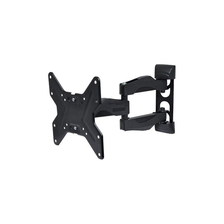 A compact articulated wall bracket for television screens up to 42” in size and 25kg in weight. Max distance from wall 342mm, folds flat to 52mm from wall surface. Provides 180° of adjustment and 15° of tilt. Mounting hole centres at 75mm, 100mm and 200mm square.