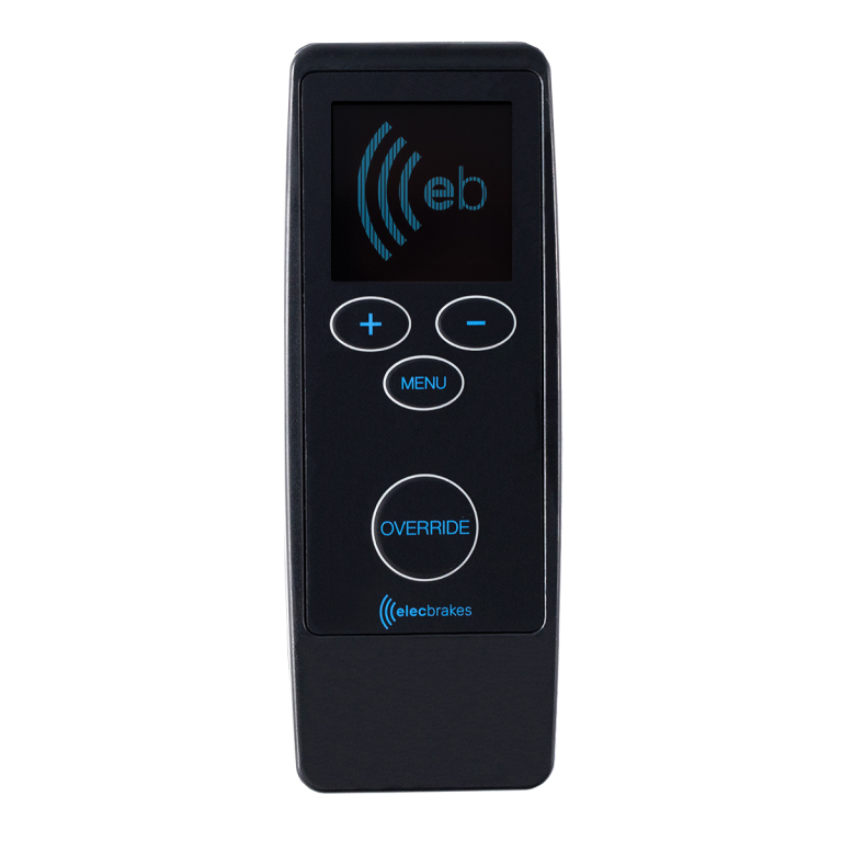 Elecbrakes in-car remote control. Allows user to control brake response, select user defined programs and activate trailer brakes only by the manual override button. Allows compliance with ADR38/04.