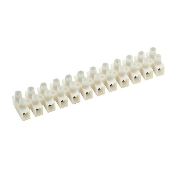 Strip of 12 terminal blocks, manufactured of polyamide (nylon), with a maximum operating temperature of 105 C (Degrees Celsius).