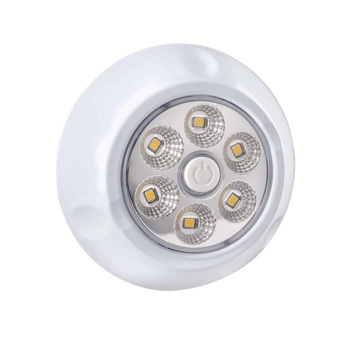 A compact and modern styled interior light utilising six powerful L.E.Ds which produce a smooth spread of crisp white light. Ideal for campers, caravans and mobile homes. Allows easy beam adjustment with 350 Degree swivel and 35 Degree tilt.