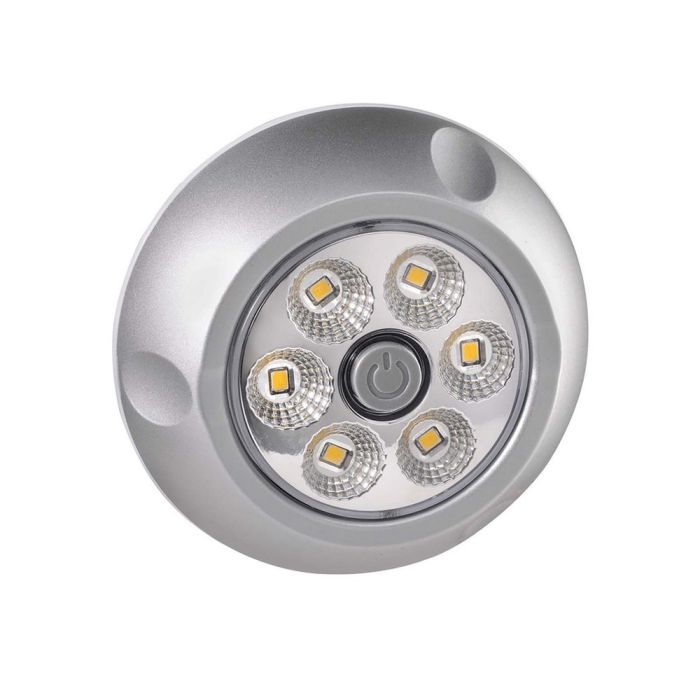 A compact and modern styled interior light utilising six powerful L.E.Ds which produce a smooth spread of crisp white light. Ideal for campers, caravans and mobile homes. Allows easy beam adjustment with 350 Degree swivel and 35 Degree tilt.