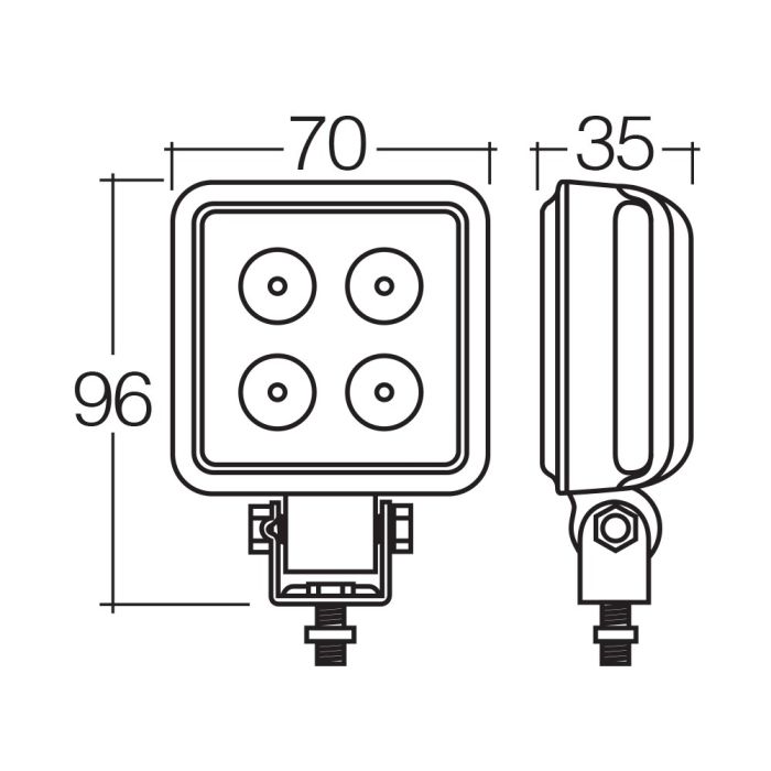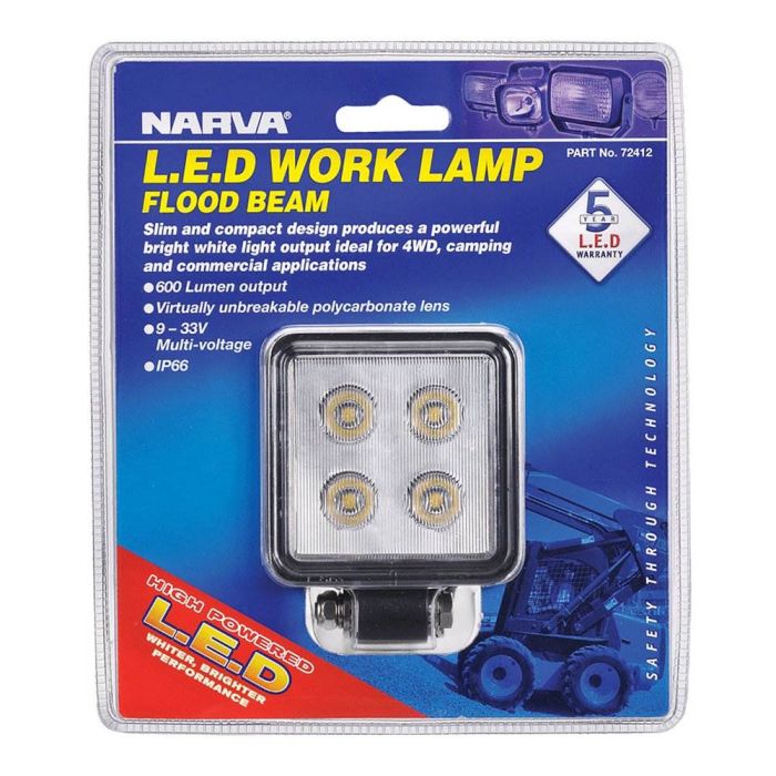 Features: A powerful 4 x 1W slim and compact L.E.D work lamp measuring just 70mm square, ideal for close range illumination and fitment to vehicles with limited space. Fully sealed (IP66) with apre-wired, die-cast powder coated aluminium housing.