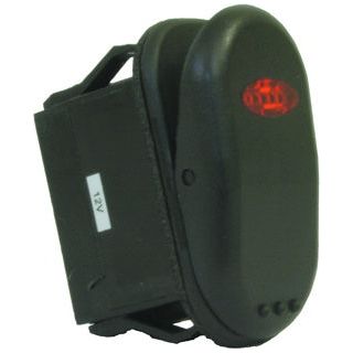 Replacement switch Quality weatherproof charcoal coloured rocker switch with Red LED illumination when on. Complete with sealing gasket. Fastens using four locking tabs fixed to switch. Suitable for 12 or 24 volt. Max 21 amp Hole cut-out : 20mm x 35mm