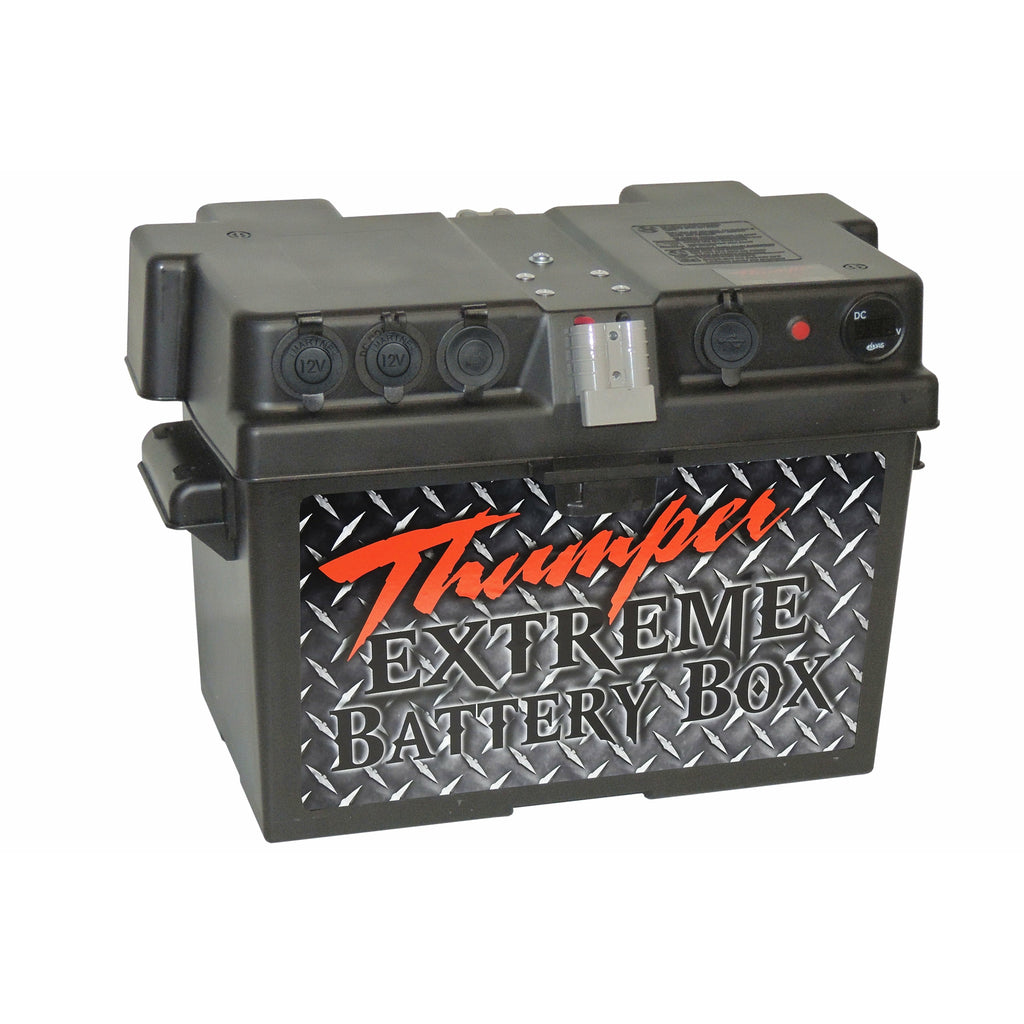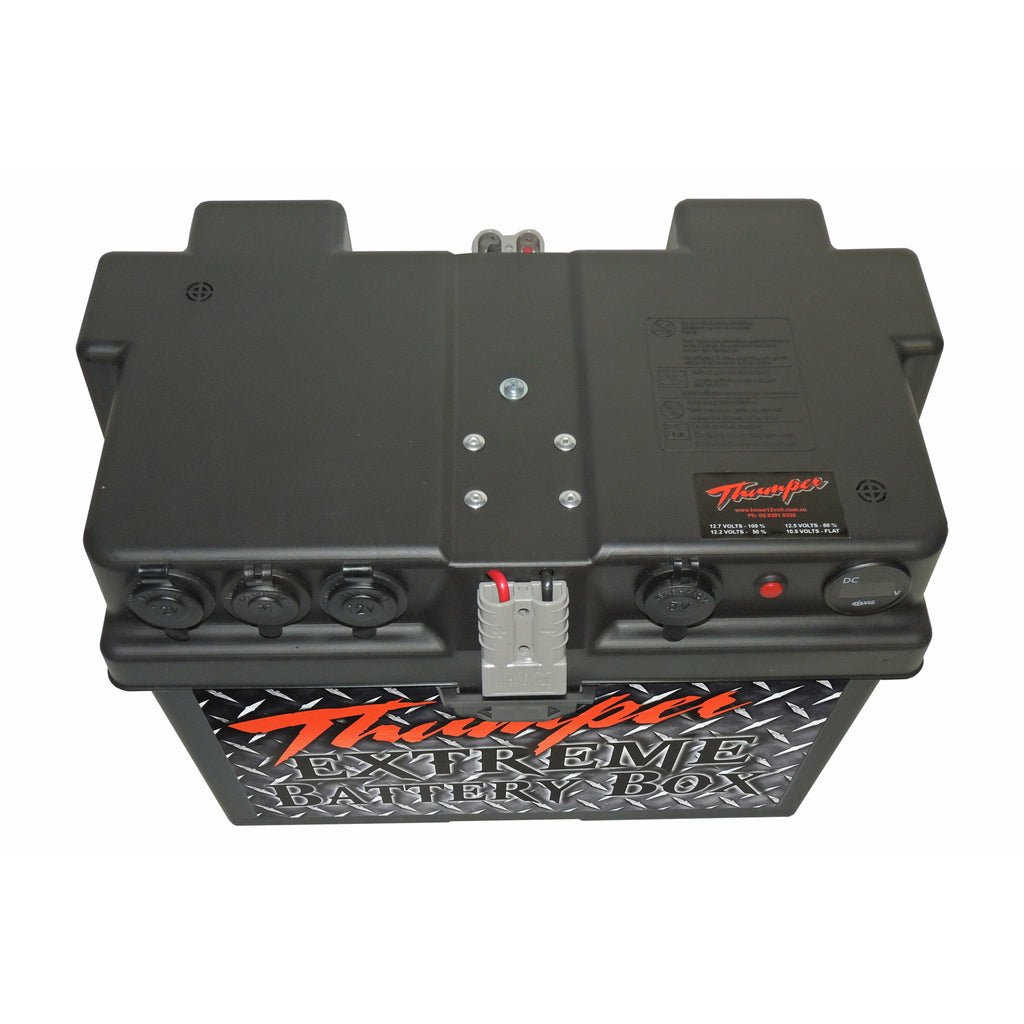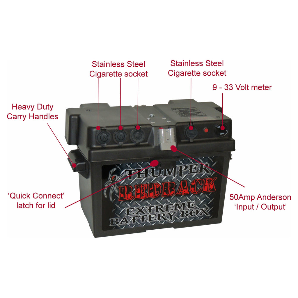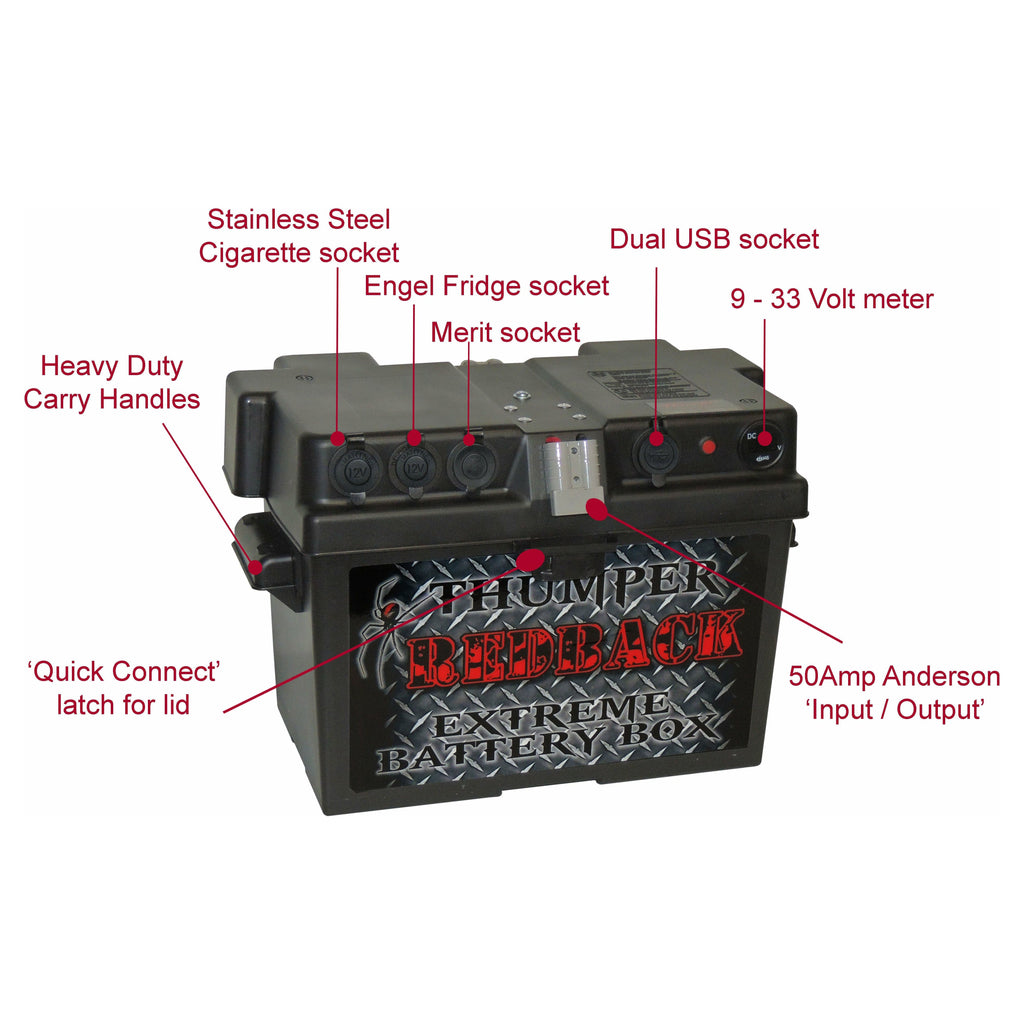 2 x Marine grade Cigarette type socket - rated to 16 Amps Includes rubber cap design to protect all sockets. 1 x Engel Fridge type socket (2 prong design) - rated to 16 Amps Includes rubber cap design to protect all sockets 1 x Dual USB adaptor - rated to 2.5 Amp 5 volt 2 x 50 Amp Anderson connectors (one fitted to front of box and one on rear) 1 x LCD Digital Volt meter gauge Allows for accurate voltage reading of your battery (3volt ~ 30 Volts) 1 x Hold down push button switch - used for Volt gauge 1 x 30 Amp Automatic reset circuit breaker - Controls all outlet sockets inside the Battery Box 1 x 50 Amp Automatic reset circuit breaker - Control both 50 Amp Anderson connector on front & rear - All internal cabling to allow you to simply connect straight to the battery terminals ![]() |
