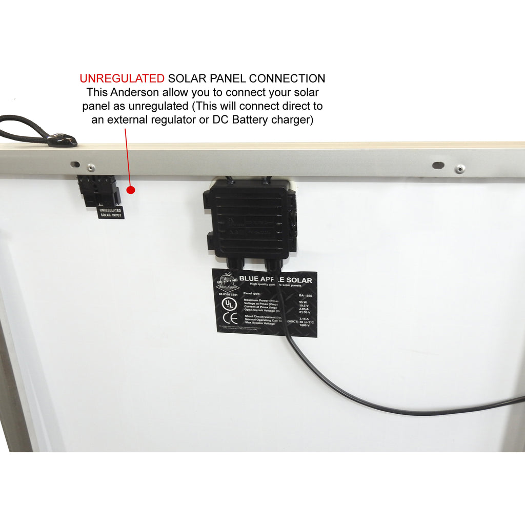 This panel is fitted with a unique UNREGULATED Anderson (Black). This option allows a DIRECT feed to the panel and will allow you to use an external regulator (such as a DC - DC charger!)